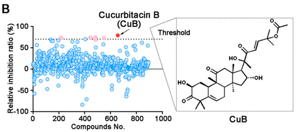 通過Biacore 8K的高通量抑制劑篩選實驗,作者得到了抑制劑篩選的排序。從圖2中可以直觀看出,六種具有較強(qiáng)抑制效果的天然產(chǎn)物被發(fā)現(xiàn),其中抑制效果最強(qiáng)的當(dāng)屬葫蘆素B(CuB)。在Huh增殖抑制實驗中,葫蘆素B同樣表現(xiàn)出了抑制作用,72h時的IC50達(dá)到1.0 uM。
