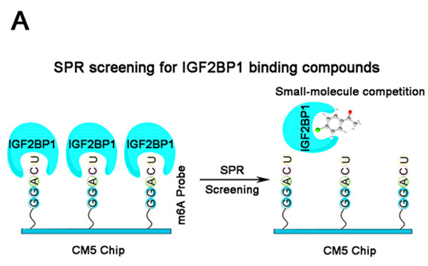 確定了治療靶點之后,作者使用Biacore 8K,直接從包含889種化合物的中藥天然產(chǎn)物庫中篩選能抑制IGF2BP1與其m6A靶點的活性分子。通過合成生物素標(biāo)記的ss-m6A,作者將RNA直接固定在芯片上,將化合物固定濃度(20 μM)與IGF2BP1預(yù)孵育,檢測RNA與化合物- IGF2BP1的結(jié)合信號,從而直接篩選出具有抑制效果的天然產(chǎn)物(圖1)。
