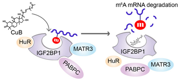 腫瘤免疫微環(huán)境(Tumor immune microenvironment ,TIME)調(diào)控因子IGF2BP1是一種關(guān)鍵N6 -甲基腺苷 (m6A) 閱讀蛋白,識別m6A靶點轉(zhuǎn)錄物,被認(rèn)為是腫瘤治療的潛在靶點。2022年曾克武教授和屠鵬飛教授團(tuán)隊發(fā)表的研究成果中,發(fā)現(xiàn)了天然產(chǎn)物葫蘆素B通過結(jié)合IGF2BP1發(fā)揮抗腫瘤作用,并且闡釋了作用機(jī)制。