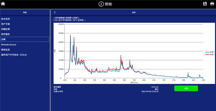 NanoPhotometer?在每次開(kāi)機(jī)時(shí)都會(huì)對(duì)光源強(qiáng)度進(jìn)行檢測(cè),初始化通過(guò)即代表光源已進(jìn)入工作狀態(tài)。在使用過(guò)程中,也可以通過(guò)光譜診斷功能,實(shí)時(shí)地進(jìn)行光源性能檢查。空白測(cè)量和基線穩(wěn)定性對(duì)于超微量而言是重要的,不少日常使用中出現(xiàn)的問(wèn)題都源自于空白和基線漂移。除了設(shè)備自身的診斷功能之外,定期的進(jìn)行設(shè)備的基線穩(wěn)定性檢查也有助于判斷和基線有關(guān)的部件是否正常,如光源、光學(xué)路徑和檢測(cè)器。